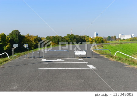 松戸市立博物館内の燻蒸作業のため立入禁止となった「21世紀の森と広場」遊歩道のバリケード
