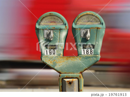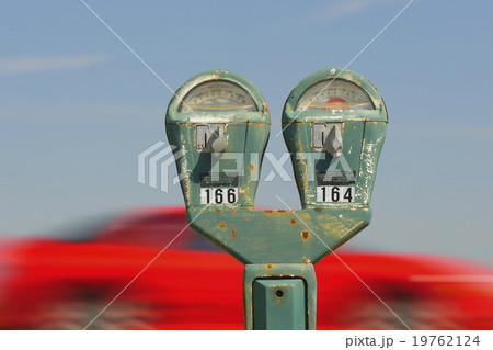 Old parking meter against panning red car