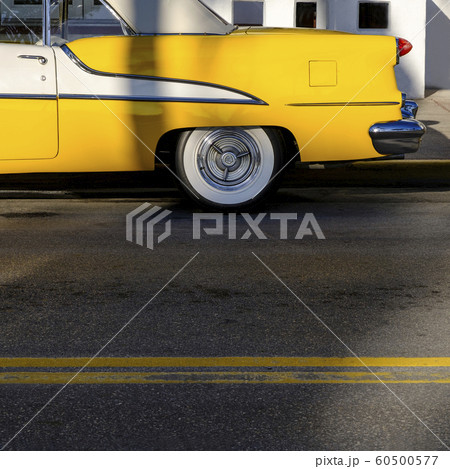 Yellow old fashioned car on road