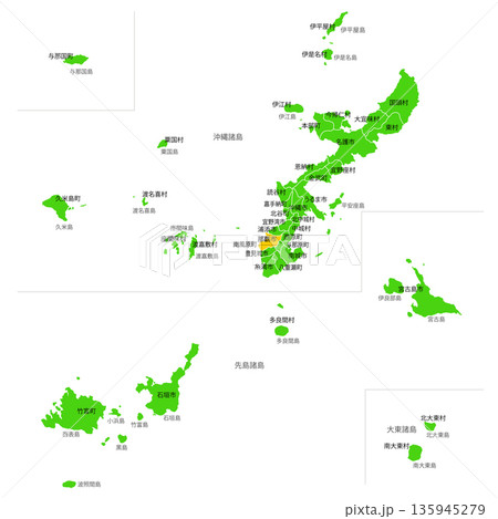 沖縄県地図・市町村区分のイラスト (筆タッチ) シンプル