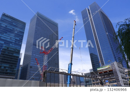 青空に映える高層ビルを建設中のタワークレーンの風景