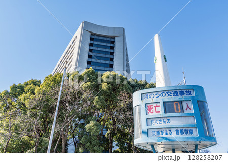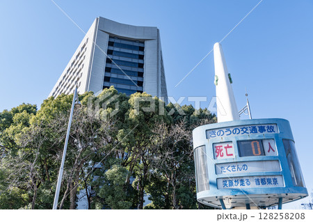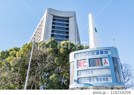 東京都千代田区霞ヶ関 警視庁本部庁舎と交通事故死者数を表示する電光掲示板