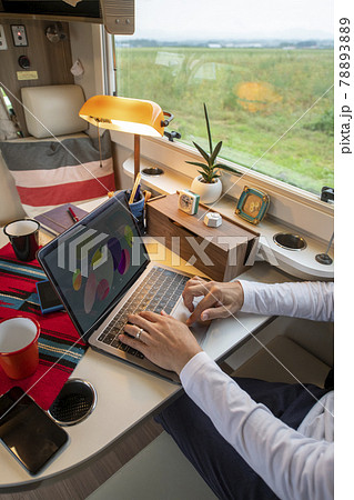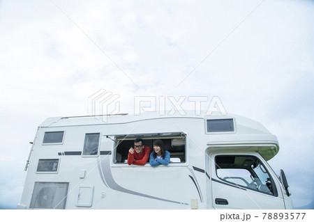 Smiling woman leaning out of camper van by beach in Fuerteventura, Canary Islands
