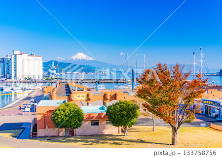 【静岡県】マリンパーク・清水港の風景 後方に富士山