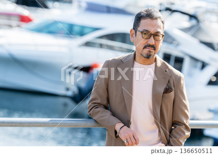 ヨットを眺めるシニアの男性 撮影協力:道の駅伊東マリンタウン