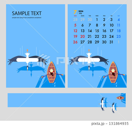 ボートを真上から見る青鷺のカレンダーと表紙デザインとバナーイラスト