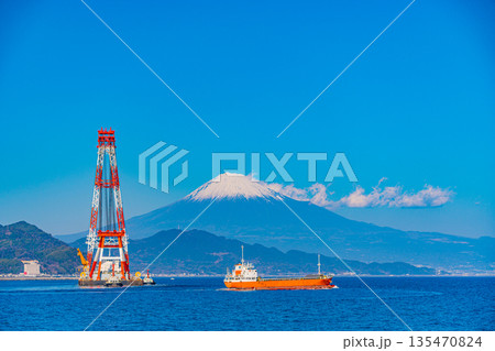 (静岡県)晴天下の清水港・行き交う船と富士山