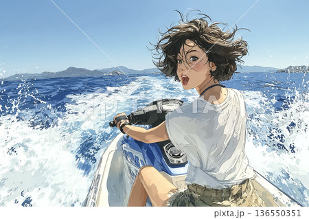ジェットスキーを操る女性|夏のマリンレジャーとアクティブなイメージイラスト