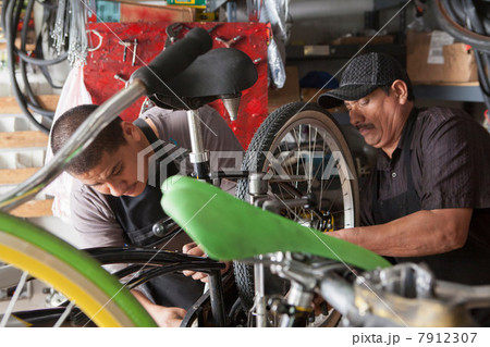 Mechanics working in bicycle shop