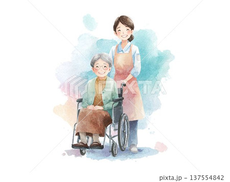 車椅子の高齢者を支える介護士の水彩イラスト 介護福祉と安心のイメージ素材