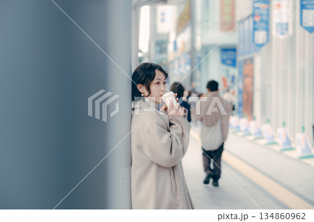 バス停でコーヒーを飲みながら待つ30代女性のポートレート