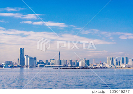 【湾岸風景】よく晴れた冬の日の横浜・大さん橋から見る横浜ベイブリッジ【神奈川県】