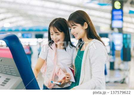 空港でセルフチェックインをする女性二人組 「撮影協力:関西国際空港(KIX)」