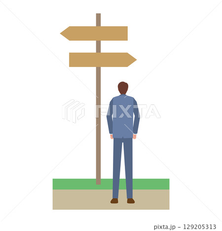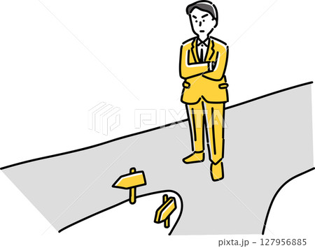 分岐点で立ち止まり迷うビジネスマンのイラスト