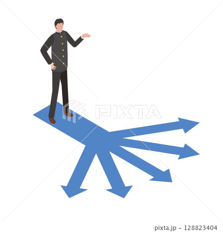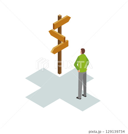 二股に分かれた分岐路に出くわしている若い男性のアイソメトリックイラスト