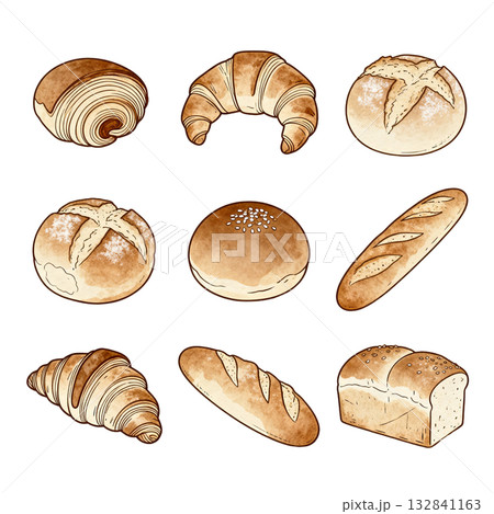 フランス系パンのリアルな水彩イラストセット
