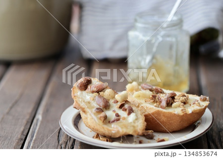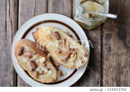 ミックスナッツのハニーバタータルティーヌとハチミツの瓶 バゲットオープンサンド