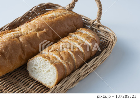 白背景の籠にいれたフランスパン