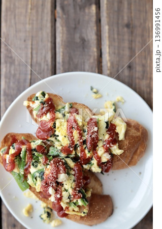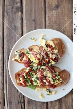 ほうれん草入スクランブルエッグを乗せたバゲットトースト