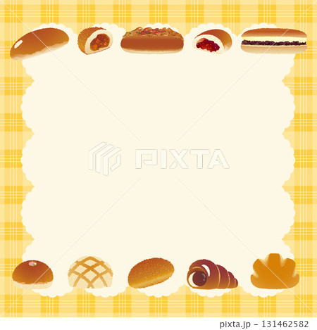 パンのフレーム_懐かしいパン勢揃い_チェック柄のテーブルクロスとランチマット_正方形黄橙色