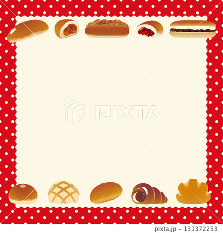 パンのフレーム_懐かしいパン勢揃い_水玉テーブルクロスとランチマット_正方形赤