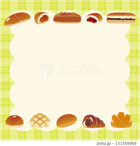 パンのフレーム_懐かしいパン勢揃い_チェック柄のテーブルクロスとランチマット_正方形黄緑色