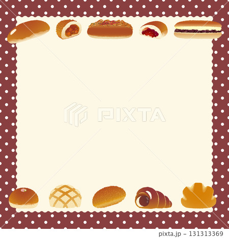 パンのフレーム_懐かしいパン勢揃い_水玉テーブルクロスとランチマット_正方形こげ茶