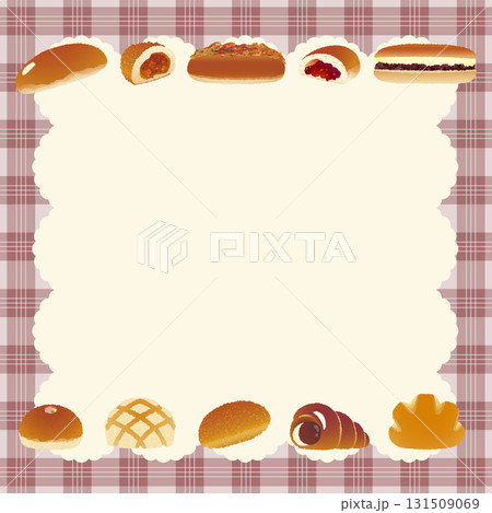 パンのフレーム_懐かしいパン勢揃い_チェック柄のテーブルクロスとランチマット_正方形赤とピンク