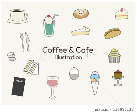 手描き風のカフェメニューとスイーツのポップなカラーイラストセット