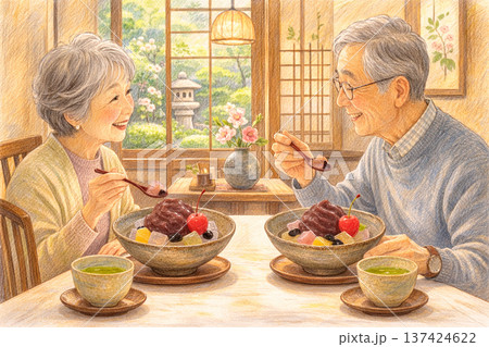 あんみつを食べてるシニア夫婦
