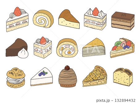 Cheesecake slice, souffle torte with mint garnish, nut crumble topping, and whipped cream swirls. Vector ink dessert artwork. Cookbook illustrations, culinary sticker sheets, recipe card layouts.