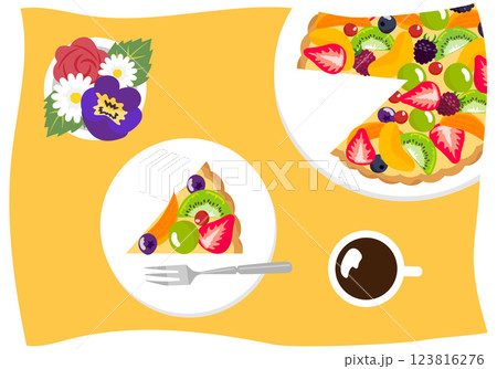 カラフルなフルーツタルトとコーヒー、花のあるテーブル
