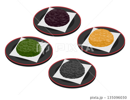 粒あん、きなこ、青のり、黒ゴマのおはぎのベクターイラスト