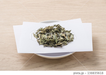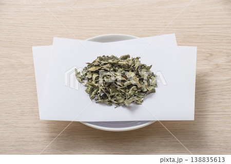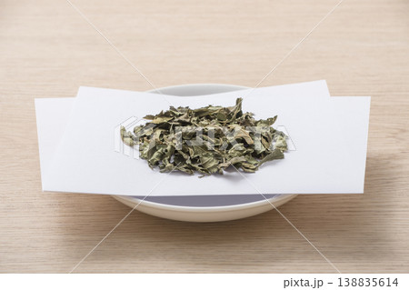 桑の葉茶 ハーブティー マルベリーティー 健康茶 皿に盛られ茶葉