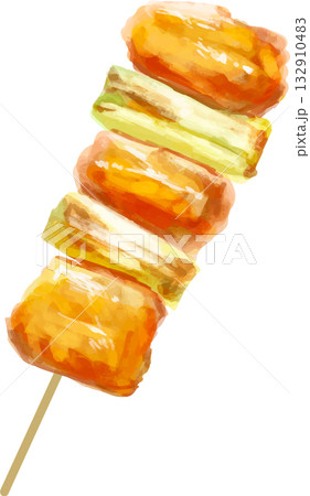 つくねの串焼きの水彩イラスト・ねぎま風の焼き鳥をリアルに描いた和風素材