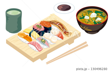 寿司盛台とお茶・味噌汁の和食セットイラスト