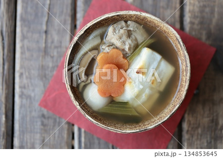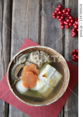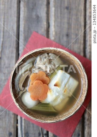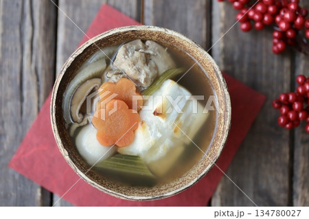 正月料理、お雑煮、御雑煮、お餅、雑煮、もち、椎茸、鶏肉、お正月料理、蒲鉾、ホウレンソウ、人参、お祝い