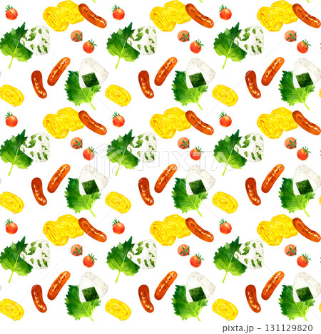 定番お弁当のおにぎり&おかずのシームレスパターン 手描き水彩イラスト背景素材