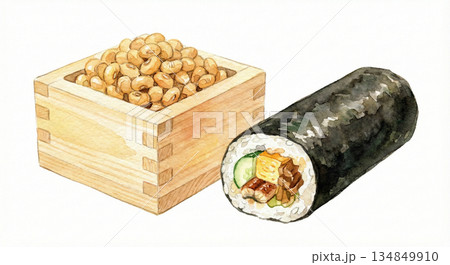 節分 升に入った福豆と恵方巻の手書き水彩風イラスト