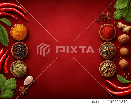 赤背景にスパイスとハーブをあしらった料理用背景素材