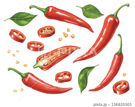 赤唐辛子のセット 野菜・薬味の手描き水彩イラスト素材