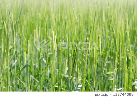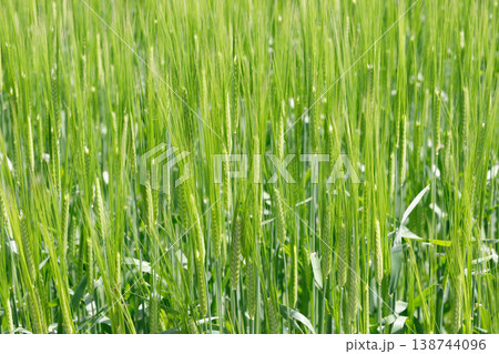【新緑素材】朝日を受けて輝く青麦【長野県】