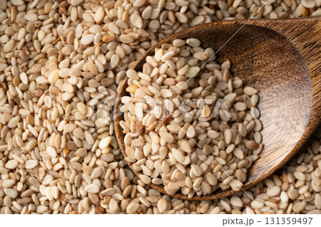 スプーンに載せた白ごま(生ごま)のクローズアップ