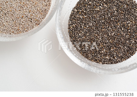 白背景にお皿に入れて並べた黒ごまと白ごまと金ごま(生ごま)