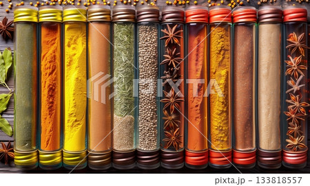 色ごとに並べたスパイス瓶の3Dフラット配置