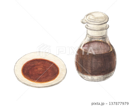 小皿に入った醤油と醤油差し 水彩色鉛筆イラスト