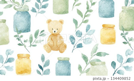 くまとはちみつ瓶の水彩パターン ナチュラルで可愛い背景素材