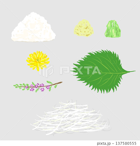 わさびと薬味のセットイラスト 根・葉・おろし金・大葉・ゴマの詰め合わせ