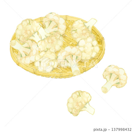 竹ざるに乗ったカリフラワーのセット 野菜の手描き水彩イラスト素材