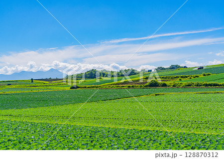 (群馬県)快晴下の嬬恋村キャベツ畑(後方に浅間山)